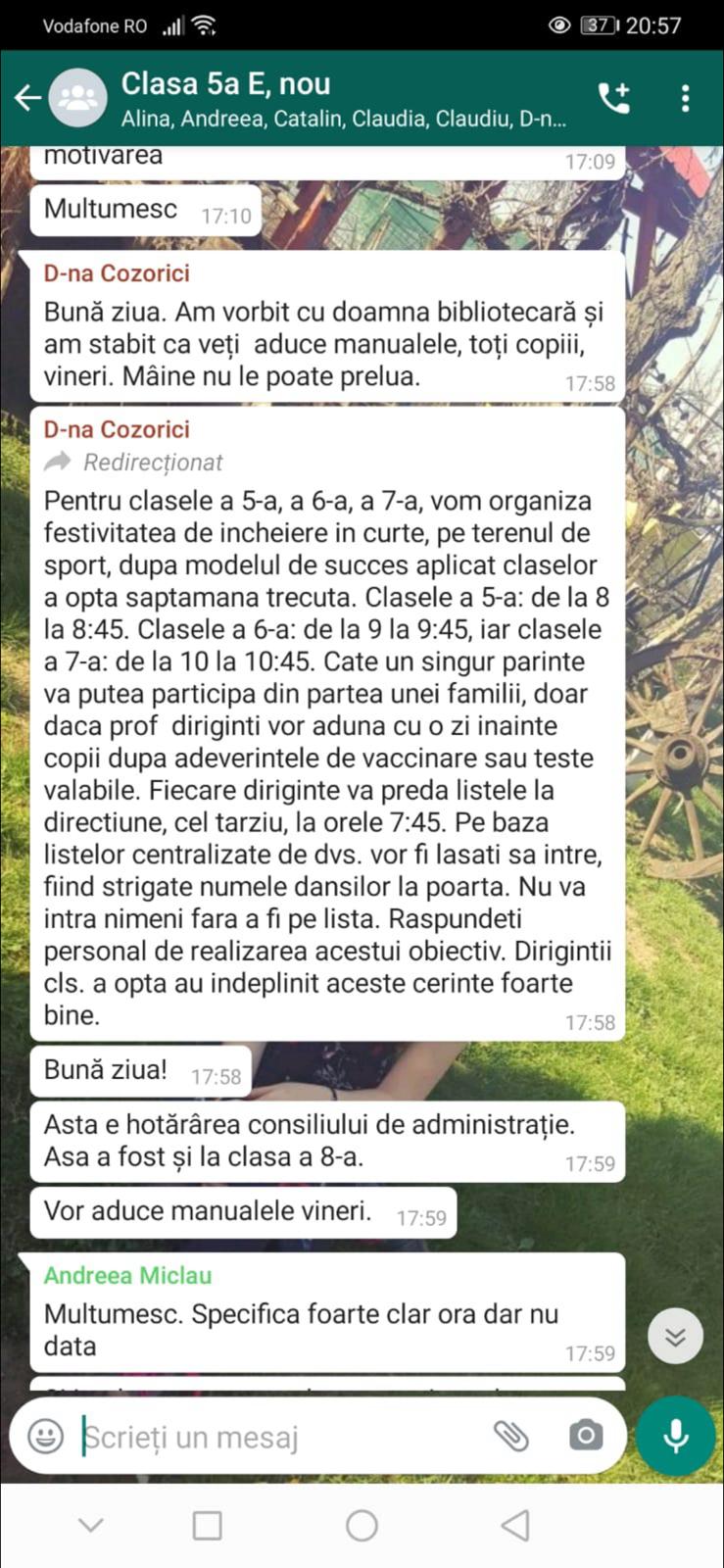 Părinții elevilor care învață la Școala Generală numărul 19 din Timișoara sunt obligați să se testeze sau să se vaccineze dacă vor să ia parte la festivitățile de final de an. Decizia a fost luată de o dirigintă care i-a informat pe părinți pe grupul de whatsapp. Recent, o decizie similiară privind condiționarea accesului la concerte în Cluj -Napoca a fost anulată de judecători.