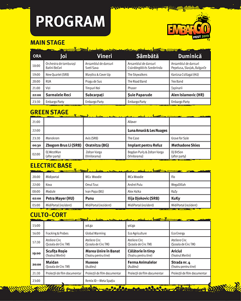 Organizatorii au pregătit patru scene, Main Stage, Green Stage, Electric Base şi Culto-Court, pe ultima fiind programate evenimente culturale.